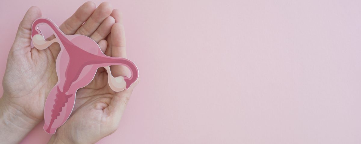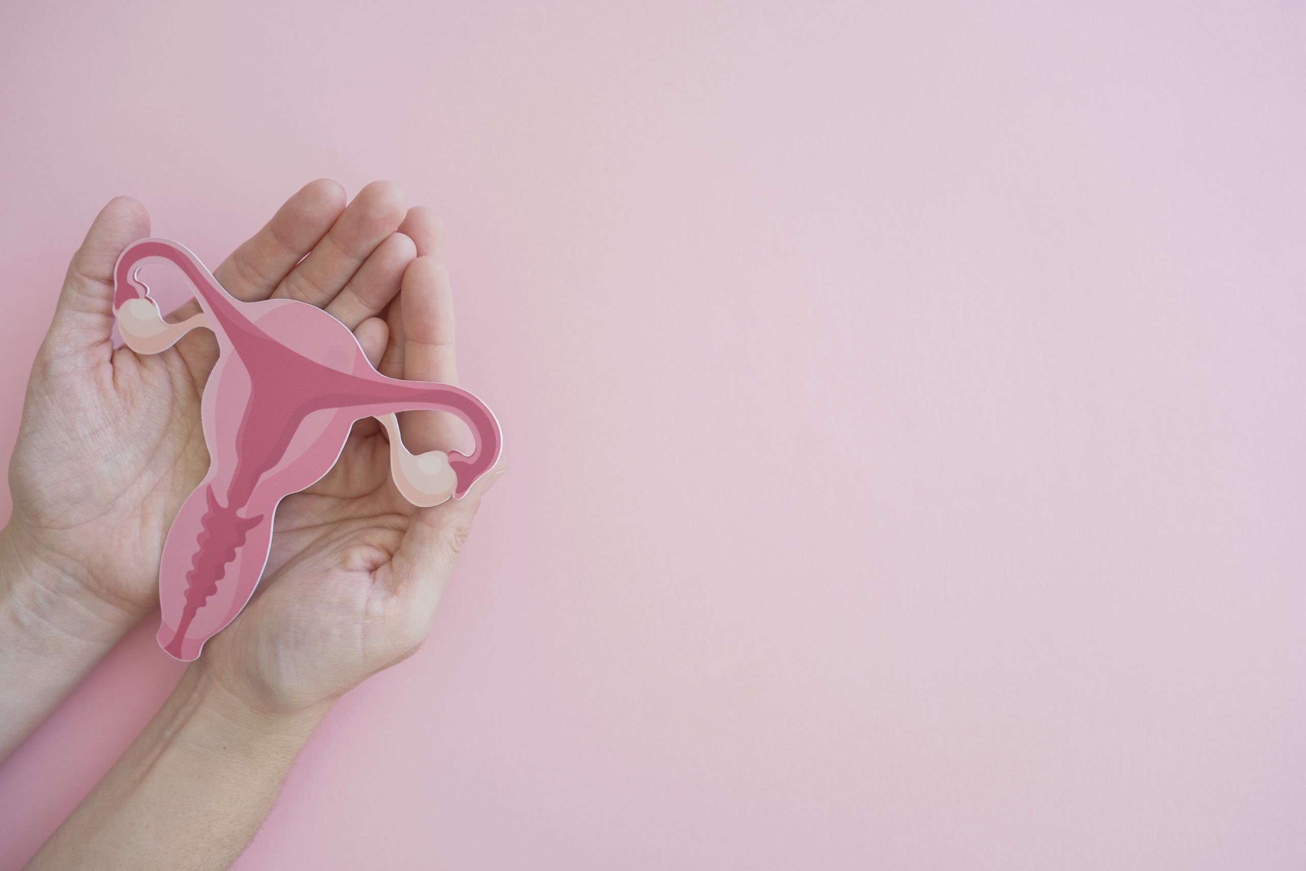 Hands holding uterus, female reproductive system , woman health, PCOS, gynecologic and cervix cancer concept